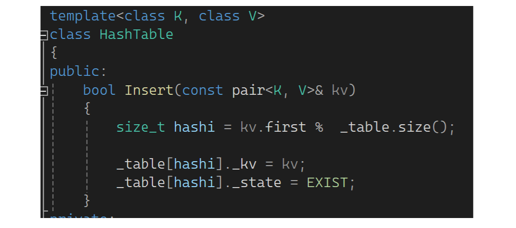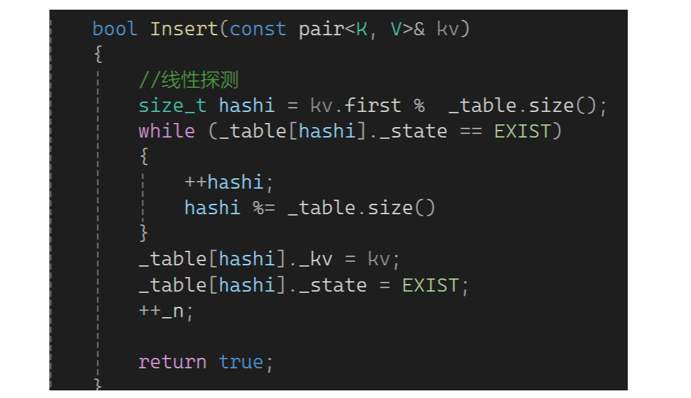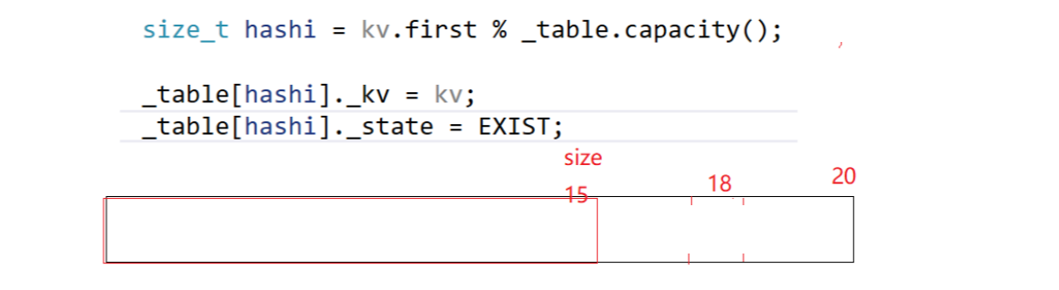 vector可以不初始化,因为它有默认构造,n可以给个值。下一步来insert一个值,insert一个pair(先不考虑扩容,把算位置的问题解决了):先算一个起始位置,可以用first模上表的大小。这的大小是size还是capacity呢?假设模的是_table.capacity,模完后刚好那个位置没有被占,就把它的值正常放进去: