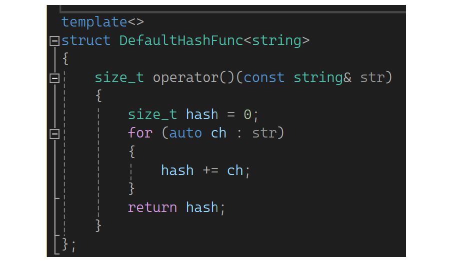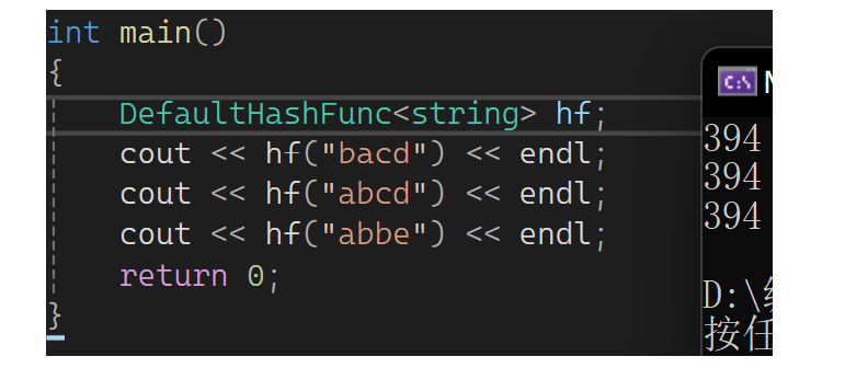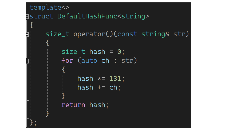 这样就可以做到不传仿函数,当K是string时走特化的,其余走正常的。但是string第一个字母ASCII值再这取模也不好,第一个字母相同的都冲突了,可以考虑把所有ASCII值加起来,这样就会好很多:
