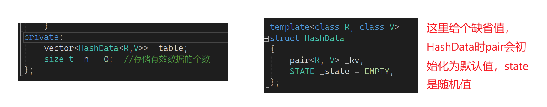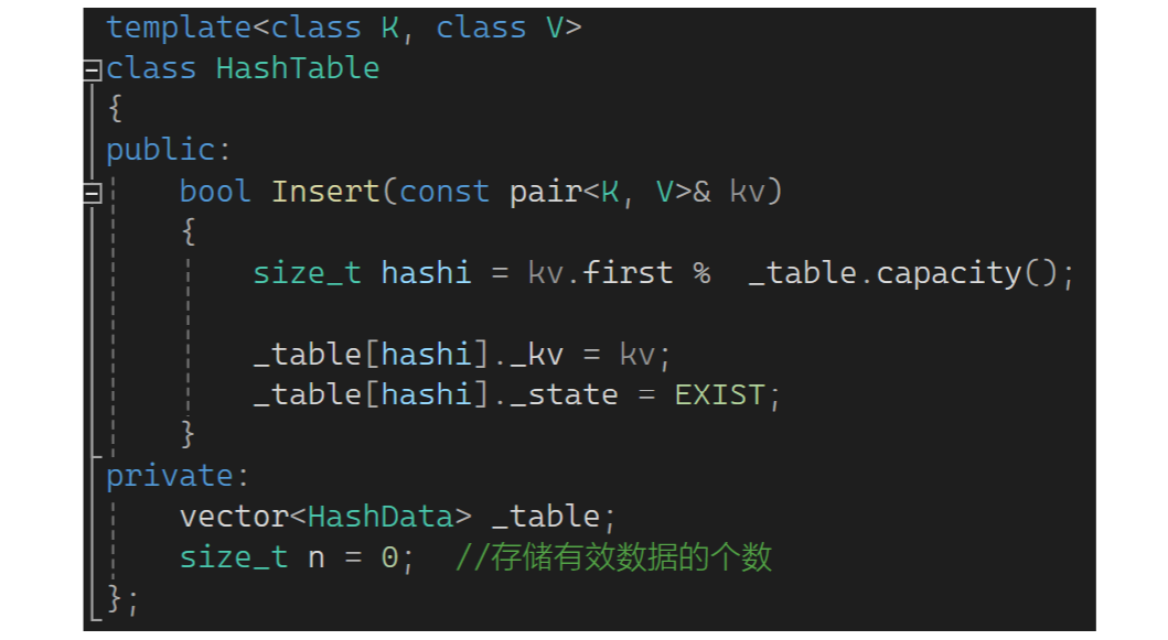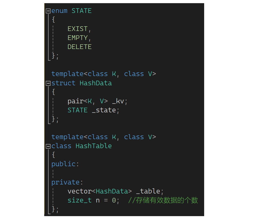 这样会有些问题:1.把6删了该位置的值抹成0还是随机值?2.此时查44会发生什么?找到空就结束了,这样删除影响了查找。怎么解决?这里要想办法用一个标记,用状态标记,这严格说有三种状态:1.EXIST存在 2.EMPTY空 3.DELETE删除。此时想删6,不需要真干了6,把这个状态设置为DELETE,然后查44时遇到DELETE不停止,遇到EMPTY才停止。下面来写一下:还是定义为KV结构,如果自己写就需要写个数组并定义数组大小及容量,现在用vector就行。这里不能直接定义出是一个pair的结构,因为除了KV还有状态,所以枚举状态。再定义一个哈希的数据,给个pair和STATE数据。哈希表中定义一个vector,里面放HashDate,再定义一个n,那vector已有size了为啥还要定义n呢?因为它和顺序表的区别是它的数据要分散存储,它的物理结构是数组,逻辑上是个哈希表,这的n表示存储的有效数据的个数: