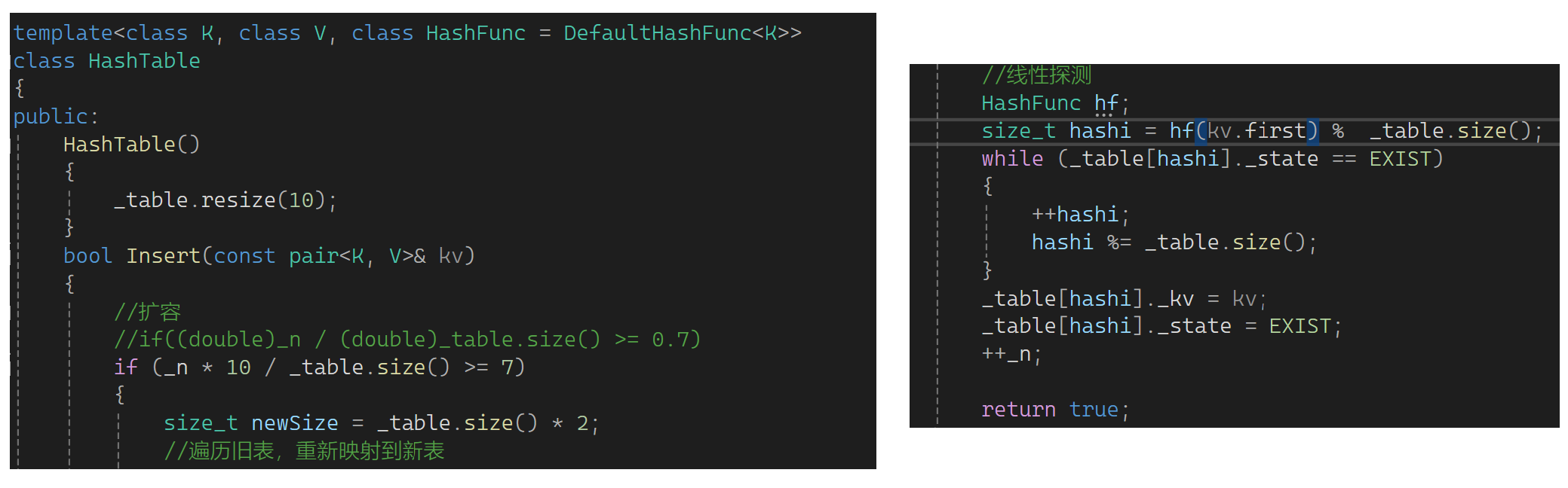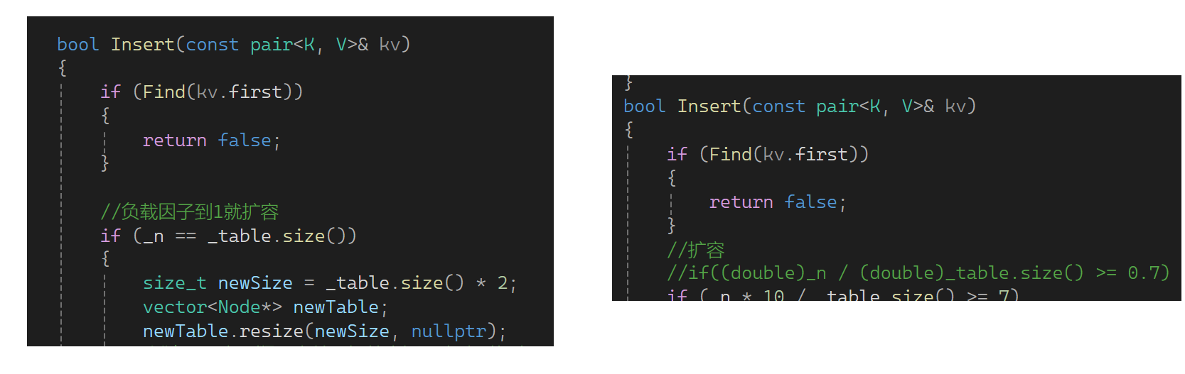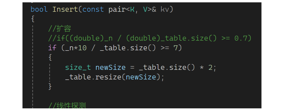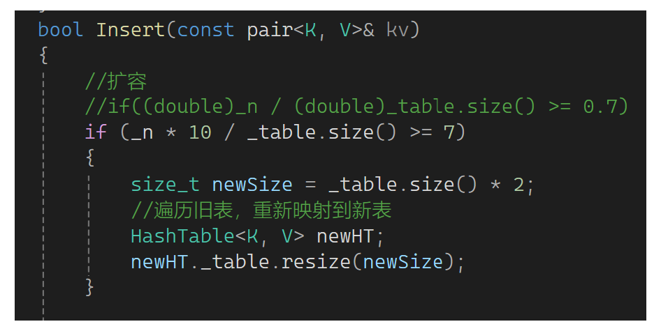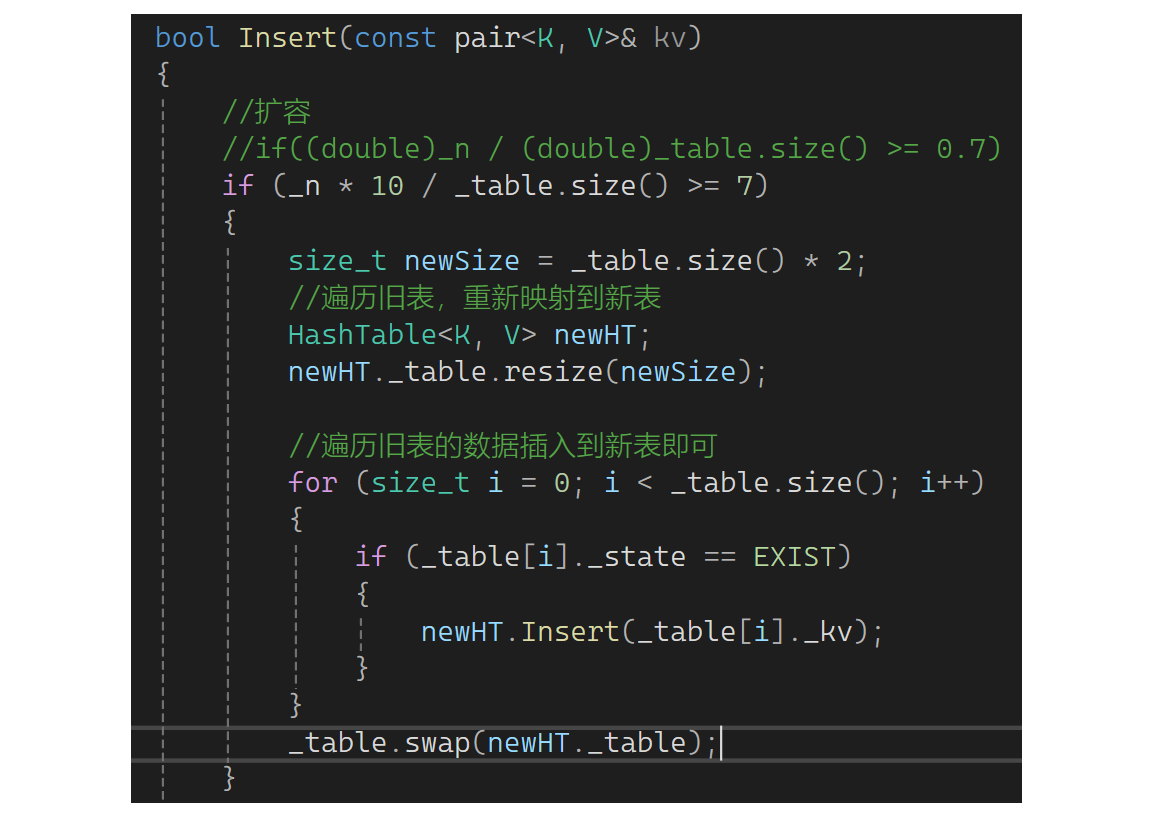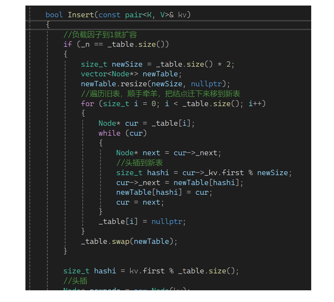 思考一下这里需要扩容吗?需要扩容,假如不扩容有大量数据时单个桶的拉链会特别长,这样查找数据时效率大大下降,和链表没什么差异了。因此还是要控制负载因子,只不过负载因子可控制的大一些,一般负载因子控制在1,意味着平均下来每个桶一个数据(理想状况)。下面实现扩容,如果_n等于_table的size就扩容。还是用原来的思想,newsize是原表的两倍,再弄个新表,把旧表数据变换到新表: