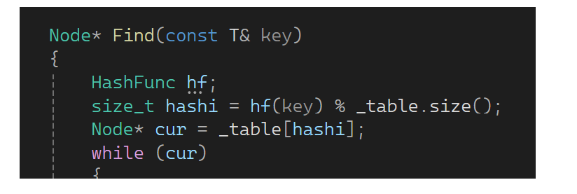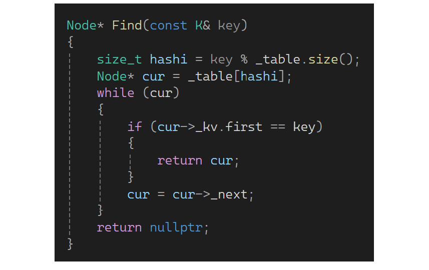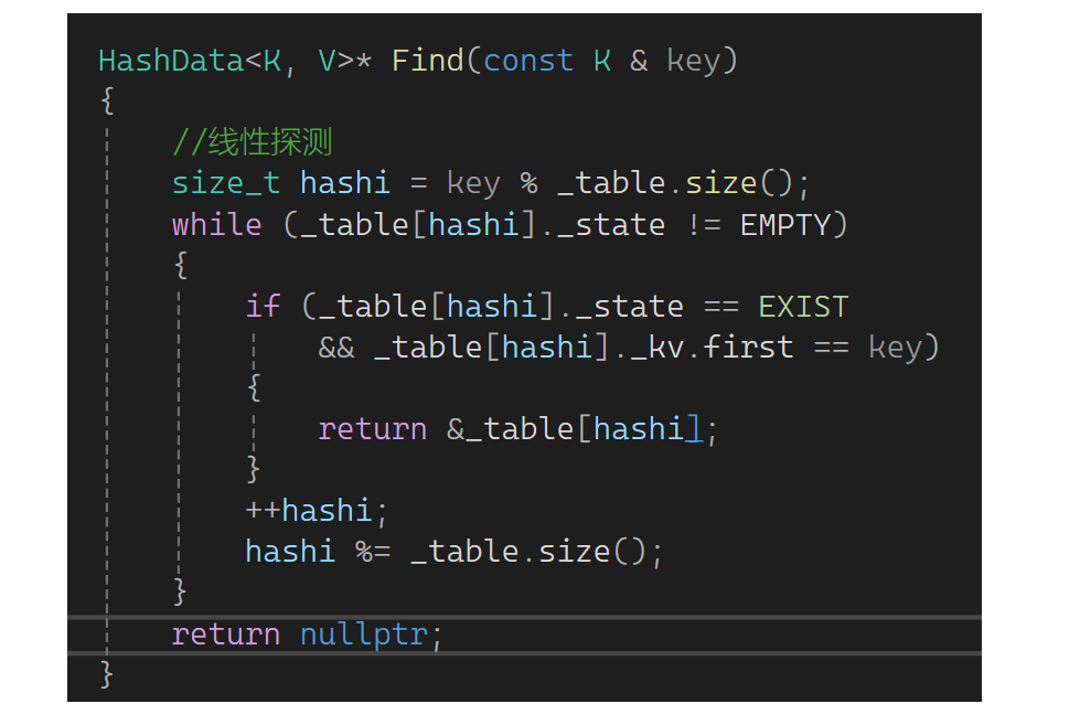 下面写一下查找:来一个key取模算出一个位置,找到空时还没有找到就结束了,否则继续。值为存在状态且如果第一个值等于key就找到了,返回该位置对象,没找到就返回空指针: