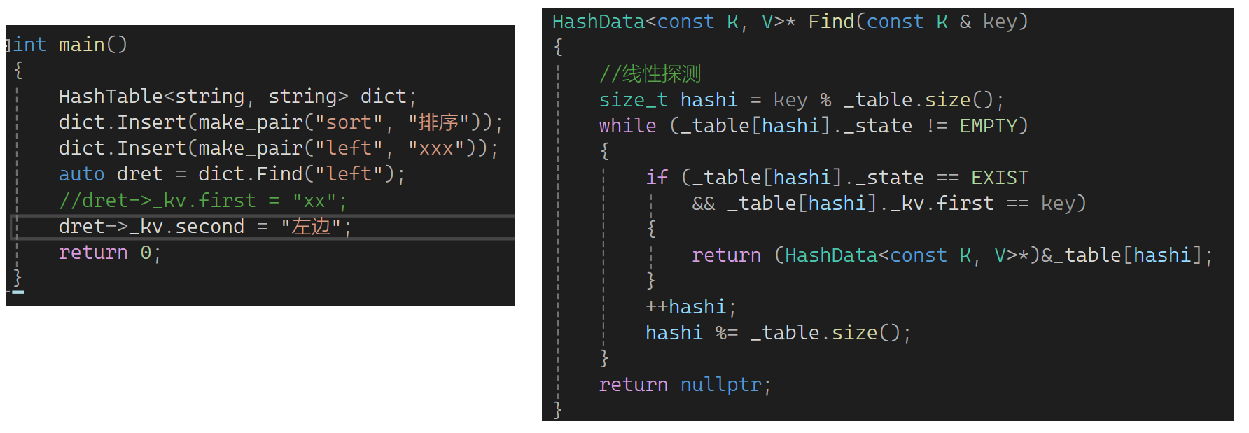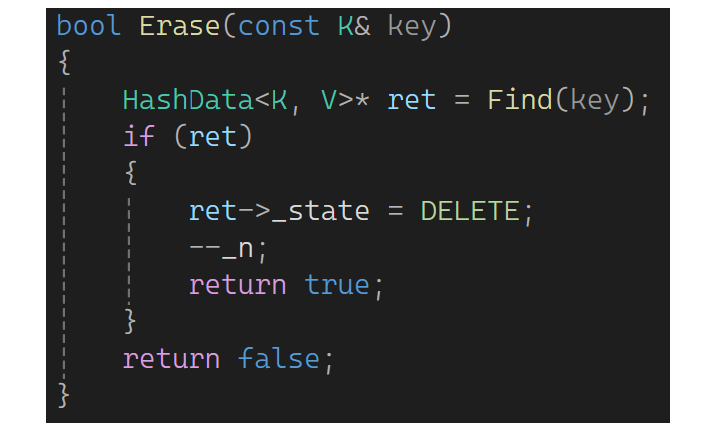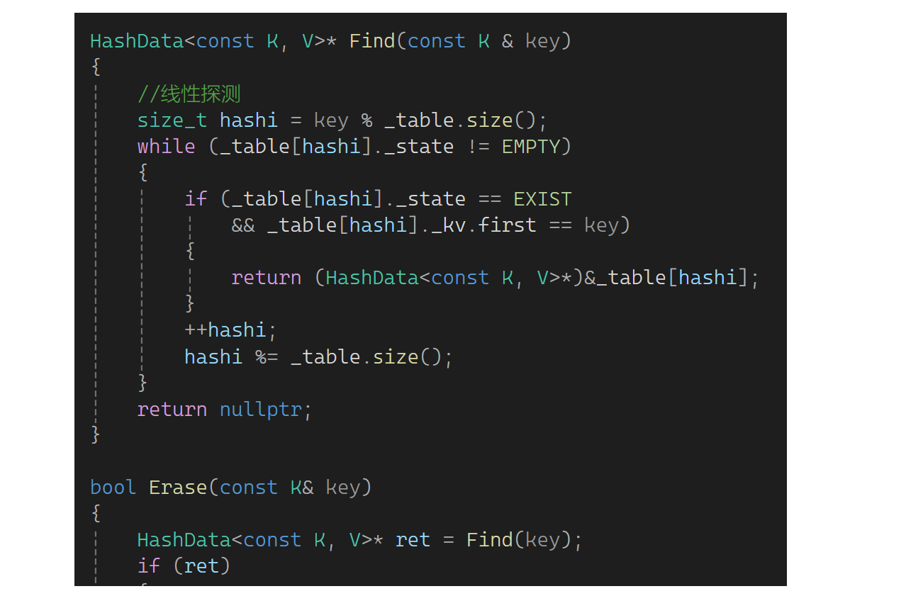 这还是有个小问题,Find这里返回的是HashData类型的指针,万人别人拿上后改状态就比较麻烦了。可以选择Find那里返回一个pair,但是Erase那的ret又不可以了。所以还是这样改: