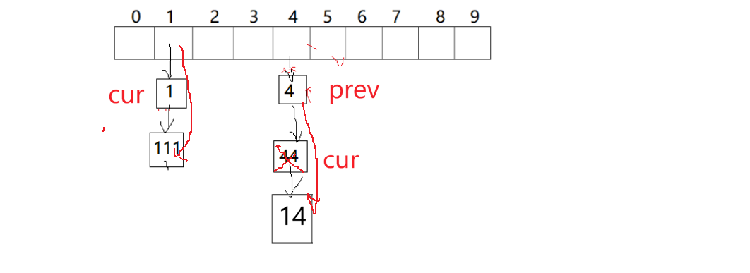 当cur删除1位置时,此时prev是空,表示头删,所以分两种情况写: