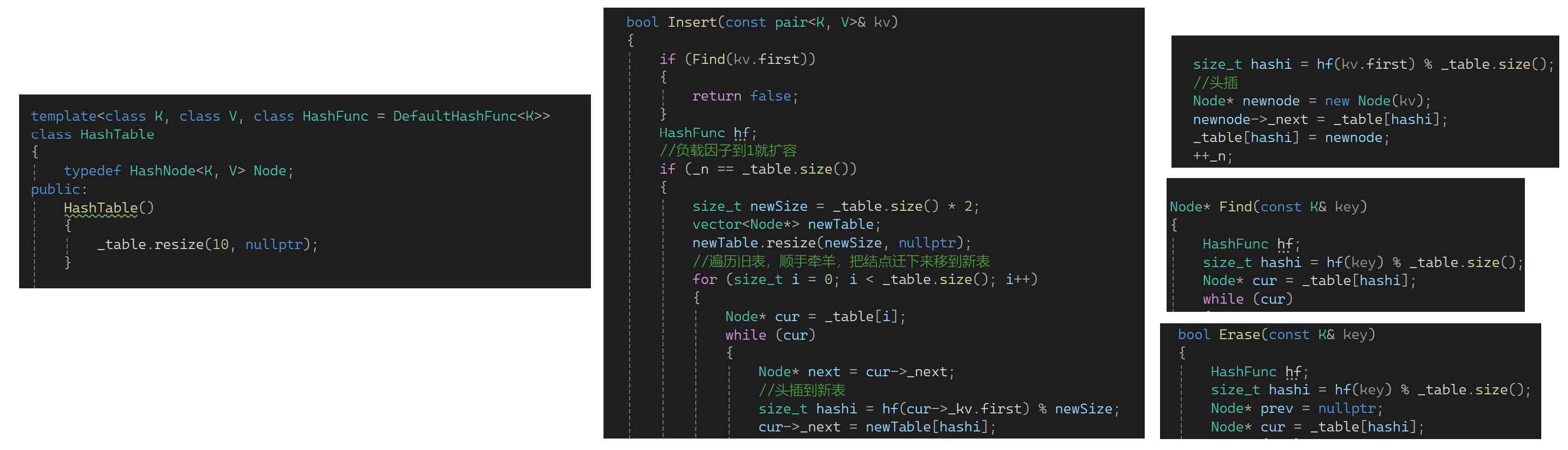 但是这种思路这里不太推荐,因为这里复用insert时会不断的新开结点,最后还要把结点一个个释放了。相当于把这些结点新开了一遍,旧节点又释放了一遍,太浪费了。因此把结点挪下去就可以了:可以定义newTable,resize一下,然后遍历旧链表,把结点迁下来到新表,当前位置迁走后置空一下。都迁走后新表是想要的,变换一下(底层是finish,start,endofstor等的交换):