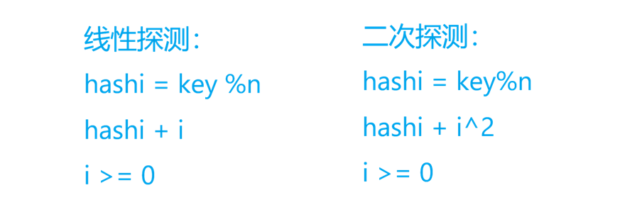 以上说的方式叫闭散列的开放定址法,特点是从当前空间里去找下一个位置,但它有很强的局限性。以上说的核心方法是线性探测,它的特征是当前位置已有值,就去后面依次找其它位置。缺陷是会导致互相堵,此时有人想能不能冲突时让它们往外分散一些,所以有人提出了二次探测。二次探测不是说探测两次,是按二次方的角度探测。比如线性探测是模一个值算出一个位置,若该位置有值不断向后找;二次探测就是每次走i^2探测: