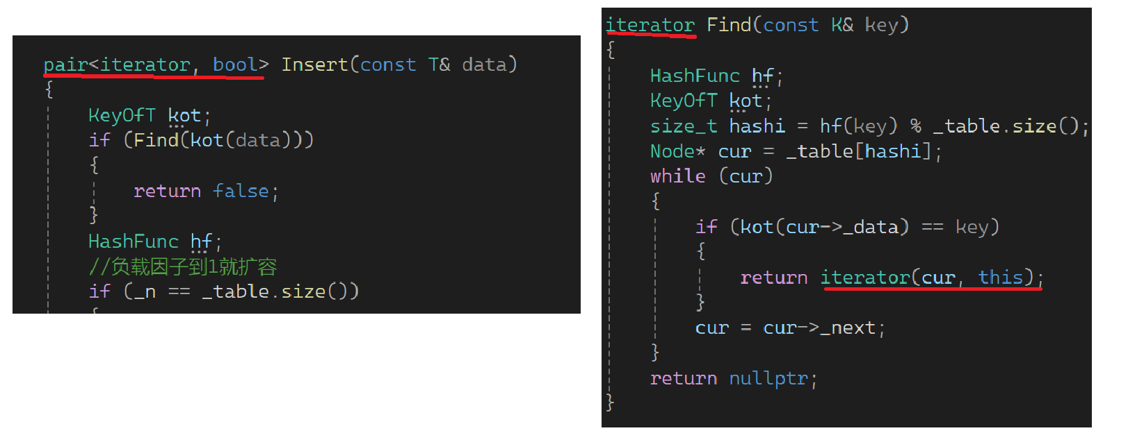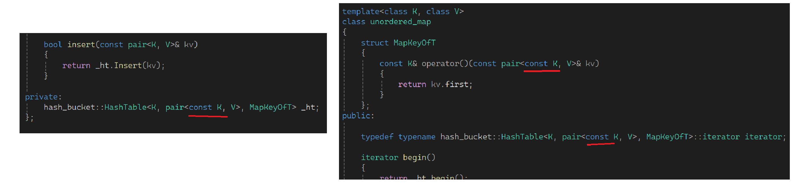 这里也不可以直接在HashData中把pair的k改成const key,若改了都没有办法赋值。再看下一部分: