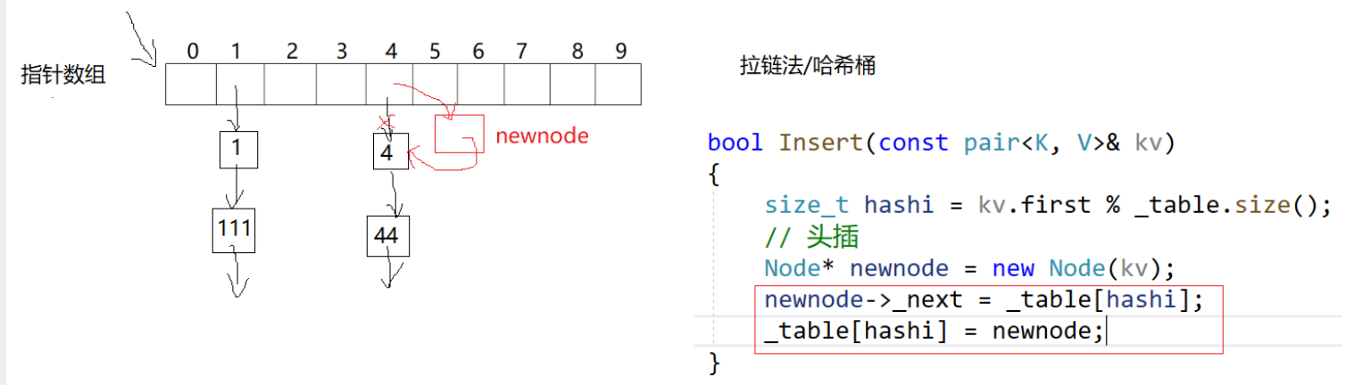 这里让newnode的next指向第一个结点,第一个结点的地址在hashi的位置,newnode此时要成为第一个,把hashi位置的地址改为newnode的就完成头插了: