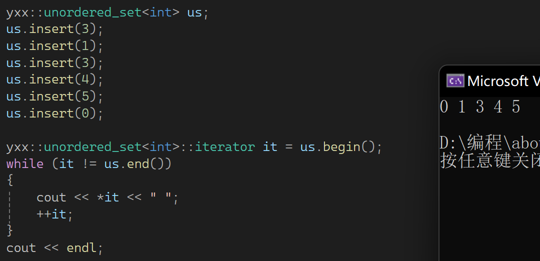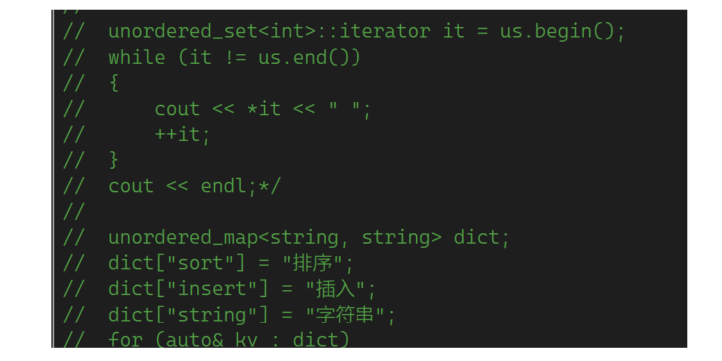 下面来看哈希,首先看关联式容器unorder_map和unorder_set,它们底层是哈希表,用法和map set一样。下面浅浅过一下,它是单向迭代器,因为没有rbegin和rend。也就是红黑树和哈希表实现的map和set用法几乎相同,区别是:1.unorder系列是单向迭代器。2.unorder系列遍历出来不是有序的。下面演示一下: