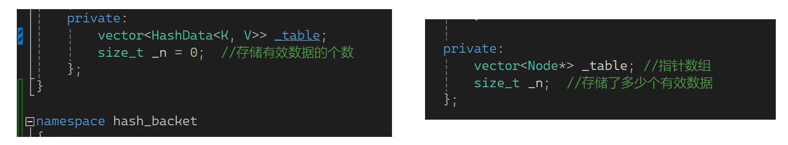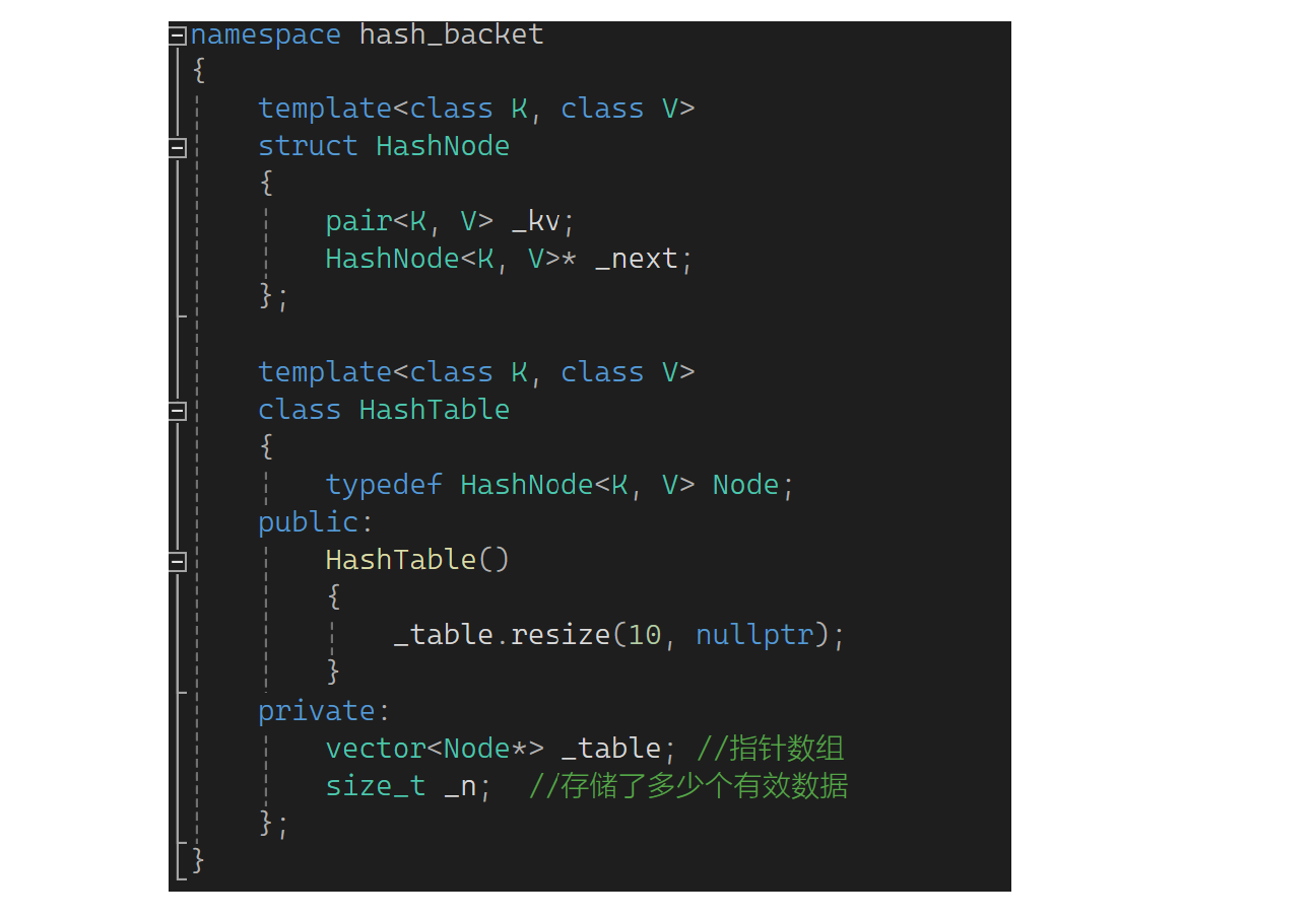 比如来了1,开一个结点把1挂起来;来了111,继续开一个结点挂起来。也就是冲突的值不是用探测的方式解决,而是用一个链表把它挂起来。下面先来搭个框架(为了防止命名冲突,前面的方法用open_address括起来,下面的方法叫hash_backet):现在的重点是,HashTable第一层基础结构是个指针数组,原来按照原生写法要定义二级指针之类的,现在可以用vector,同时也要给n记录存储了多少个有效数据。顺便写一下构造: