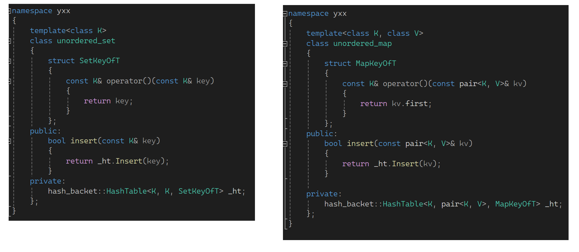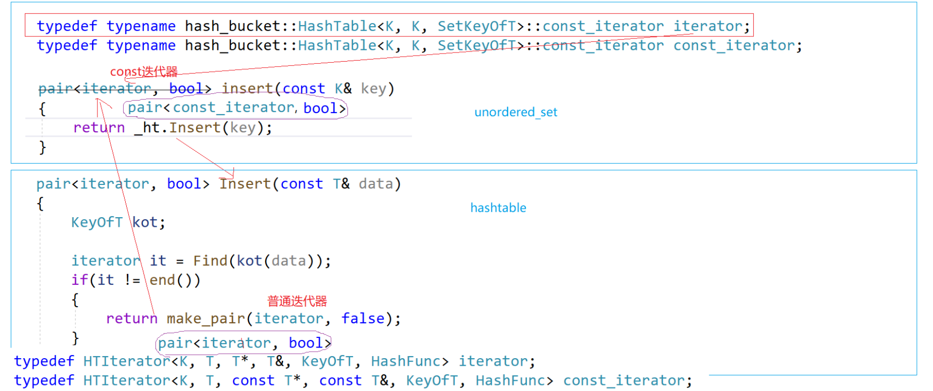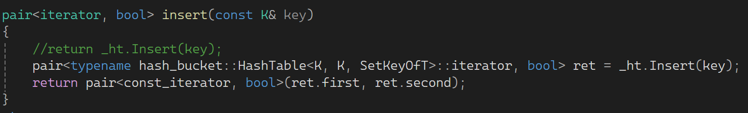 pair<typename hash_bucket::HashTable<K, K, SetKeyOfT>::iterator, bool> ret = _ht.Insert(key);