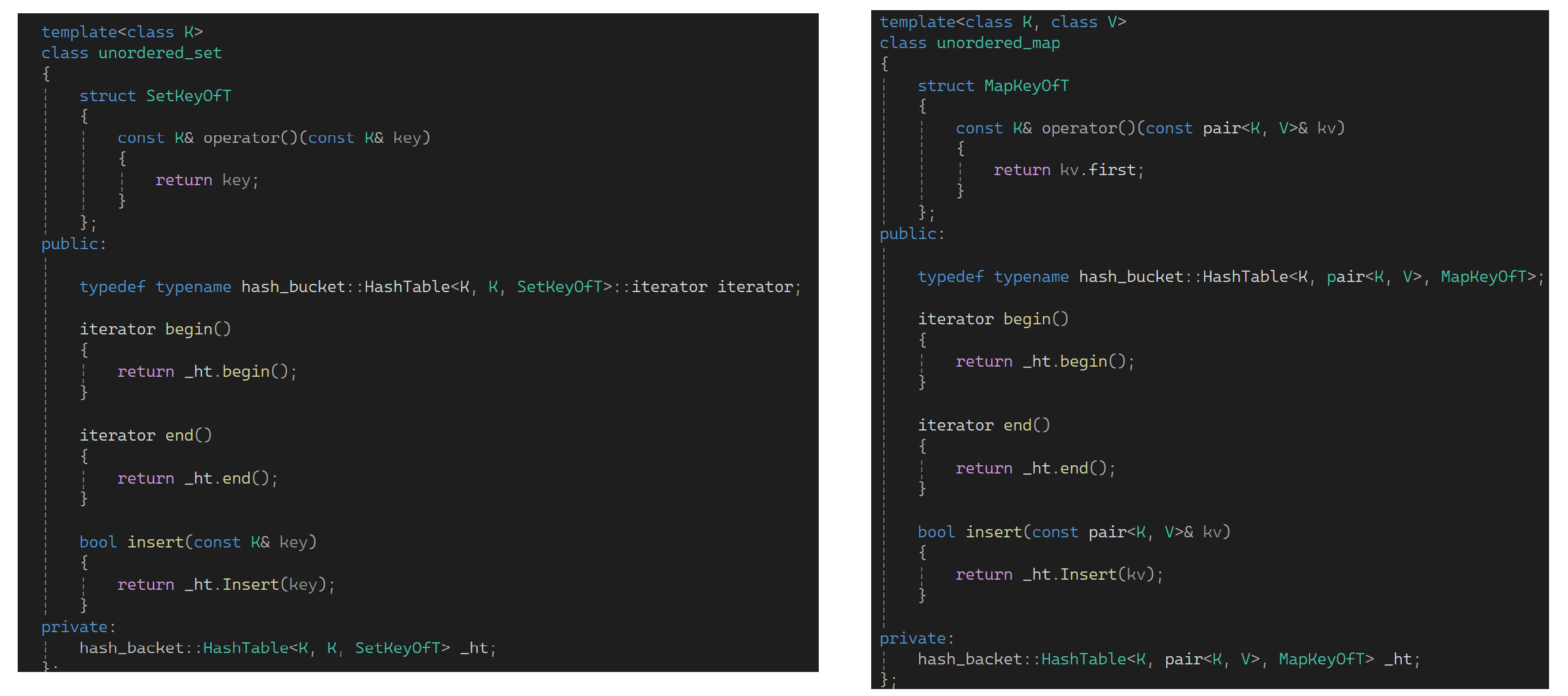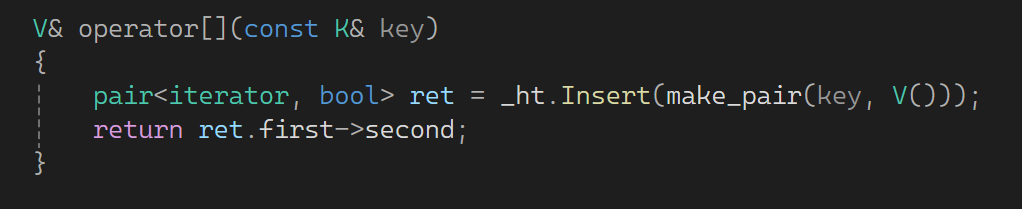 pair<iterator, bool> ret = _ht.Insert(make_pair(key, V()));