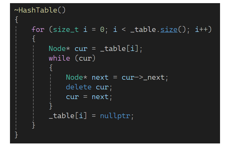 之前写的开放定址法的哈希不用写析构,vector调用自己的析构时全都干了。哈希桶这里要写析构,因为这只会释放vector的空间,不会把桶释放了,桶是内置类型,所以自己实现: