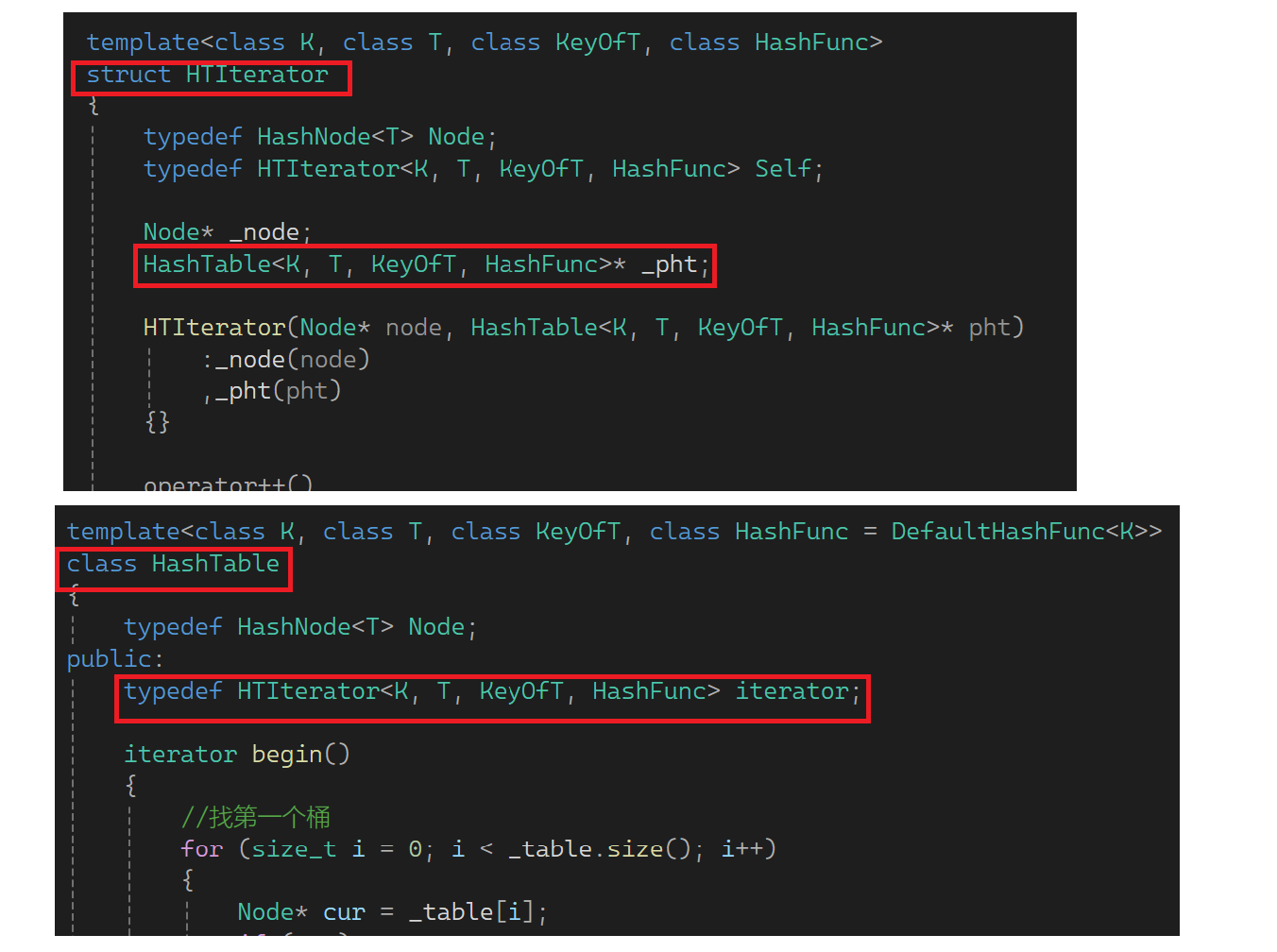 typedef HTIterator<K, T, T*, T&, KeyOfT, HashFunc> iterator;