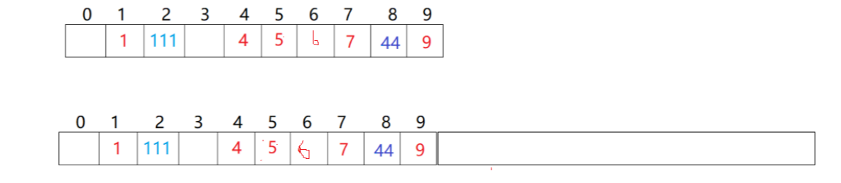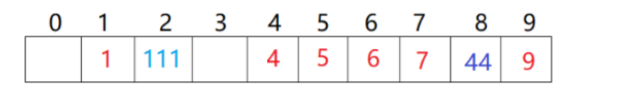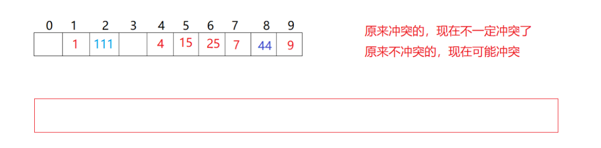 现在来了111和1冲突了,放到下一个位置。44和4冲突了,然后不断向后探测都有值,找到8位置有空位就把值放进去了。如果走完了没找到空位置,要立刻扩容吗?比如下图场景: