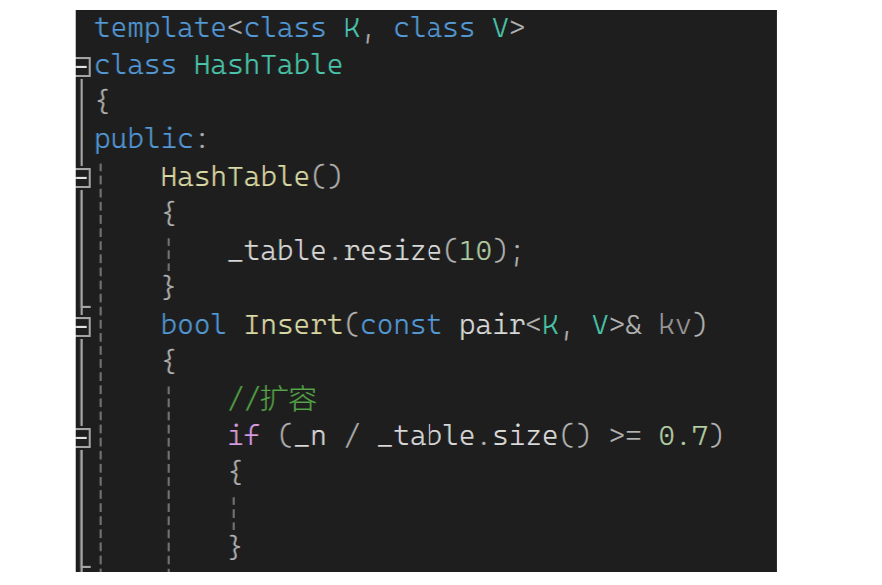 它用来标识存的值占空间的比列。负载因在越大,冲突概率越大,空间利用率越高;负载因为越小,冲突概率越小,空间利用率越低。通过上述介绍可以看到,哈希表不能满了再扩容,控制负载因子到一定值就扩容。下面写写扩容逻辑:如果table大小为0或者有效数据个数除大小大于等于0.7就扩容,为了有小数记得隐式转化为double。但table刚开始为0,可写个构造用resize让size和capacity为10: