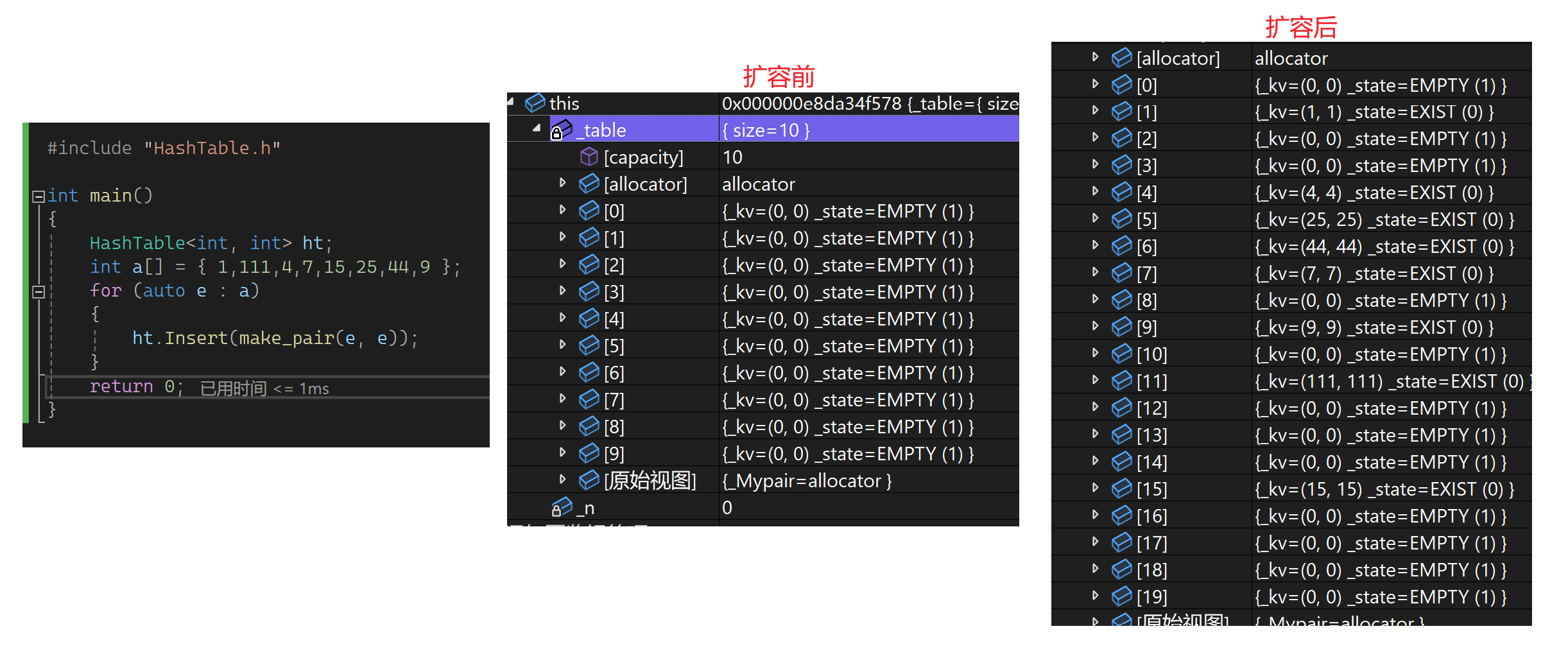 这里的亮点是再次复用了insert函数,进而复用了线性探测逻辑,空间开好后不走if的逻辑。下面测试一下: