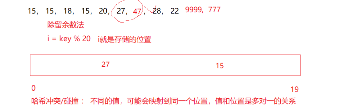 还是开固定空间,比如开20个。来个值key,这用除留系数法,通过除留的系数确定位置,满了再考虑扩容。用i=key%20(空间个数),这样算出来第i个位置,然后把值放进去。它的问题是会引发哈希冲突或碰撞,也就是不同的值,可能会映射到同一个位置,值和位置是多对一的关系,比如下图: