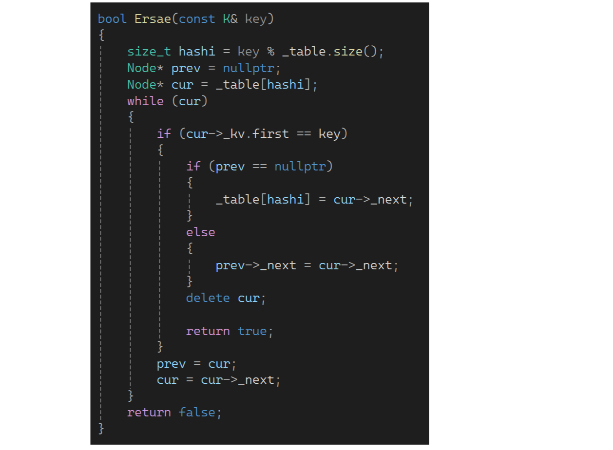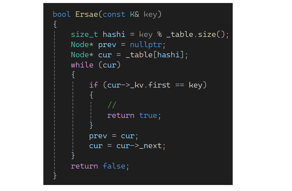 再来写一下删除,可以复用find找到要删除的值,如果找到了改为删除即可,--n并返回true;没有找到返回false: