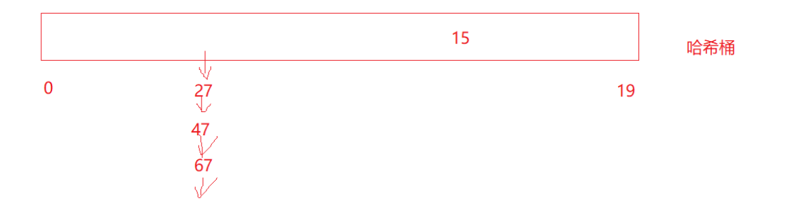 27和47模20都是7,在同一个位置,那怎么办?有一种方法是再按照一种规则去找下一个位置存,比如有种方式叫闭散列------开放定址法:1.线性探测 2.二次探测。也就是找的这个位置被占了,再去找其它位置占。还有一种方式叫拉链法,也叫哈希桶。这个位置存指针,把桶用指针链接起来,一个位置有多个值来个多对一的关系,这种方式不影响别人: