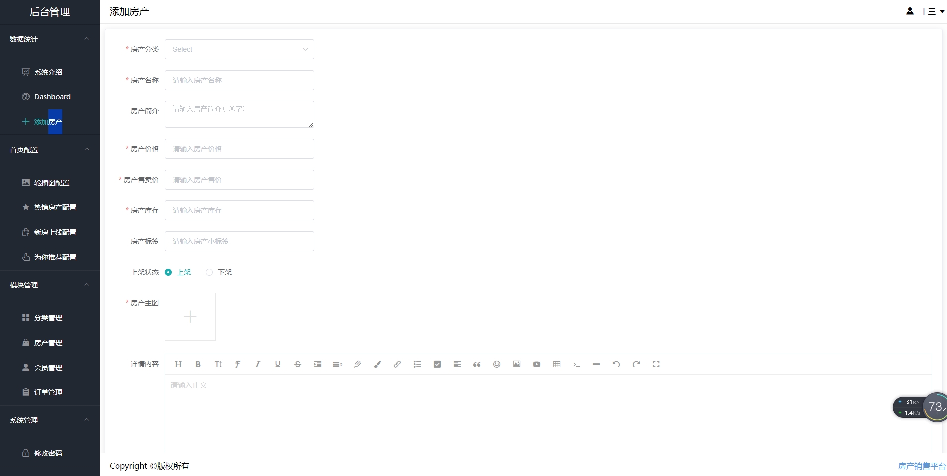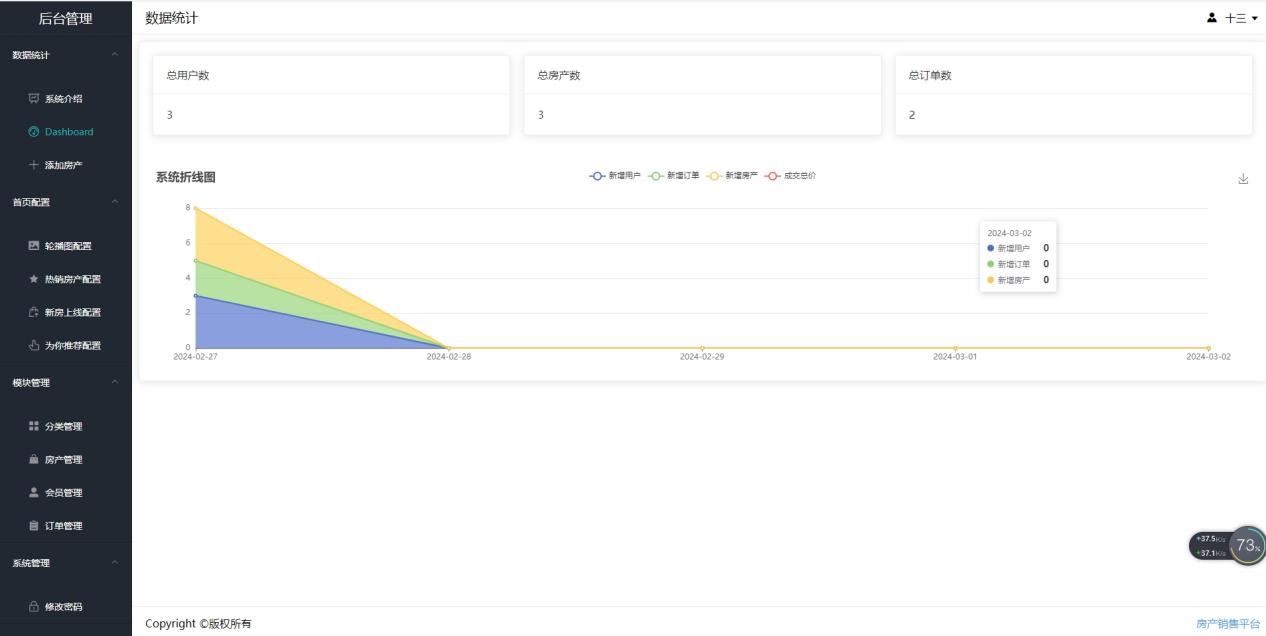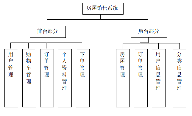 后台管理相关功能主要包括:(1)添加房产;(2)处理订单;(3)查询用户信息;(4)分类管理。