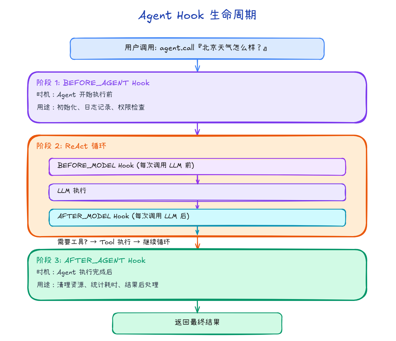 ReactAgent 的执行过程有明确的生命周期,我们需要在不同阶段插入自定义逻辑。举一个最简单的🌰,比如我们需要在Agent进行了一次完整全链路的响应回复之后。需要计算当前轮次回复消耗了多少Token,同时对本次推理的Token费用进行计算。