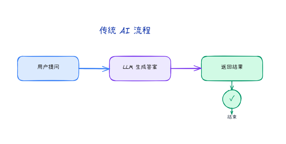 传统的 AI 应用(如 "古老的 ChatGPT 3.0 时代")是"一问一答"模式: