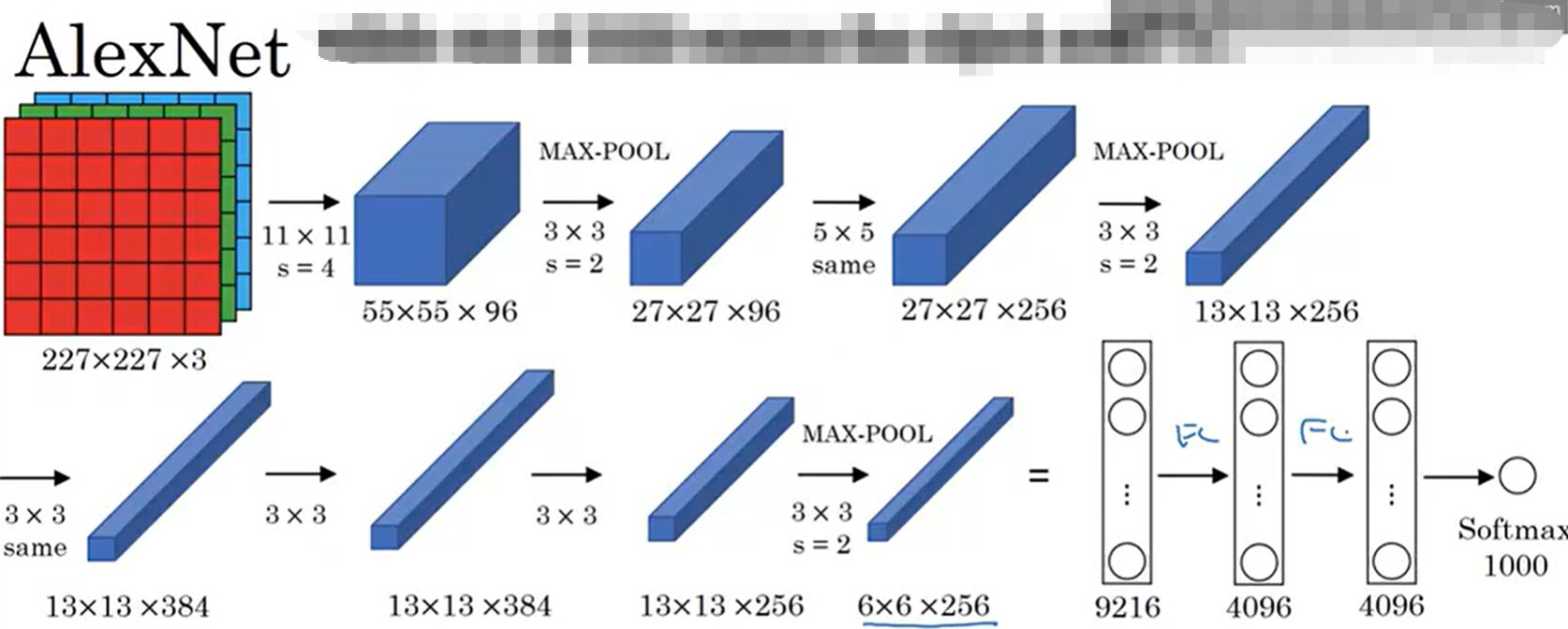 输入层:227×227×3(RGB彩色图像,三通道,尺寸远大于LeNet,需要多轮卷积降维);