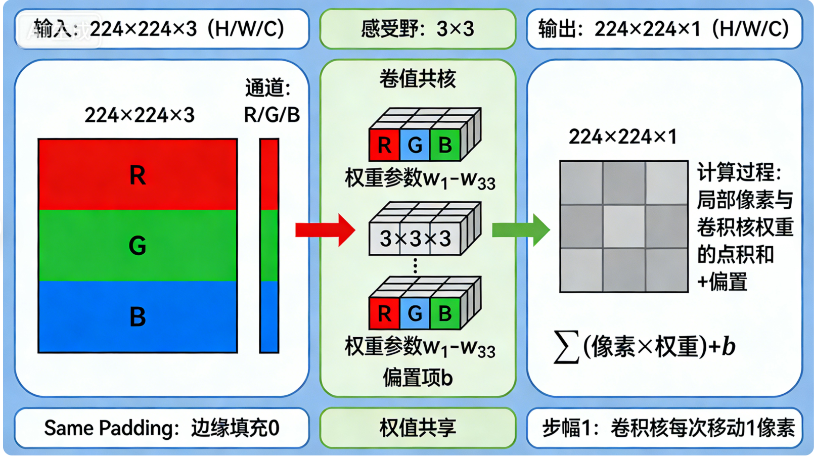 卷积层是CNN的核心特征提取模块 ,其设计灵感来源于人类视觉系统的感受野机制------人类眼睛对视野内的局部区域敏感,而非一次性感知全部画面。卷积层通过局部卷积操作 ,在保留图像空间结构的前提下,提取局部特征,同时通过权值共享大幅减少模型参数,解决了全连接层处理图像时参数爆炸的问题。