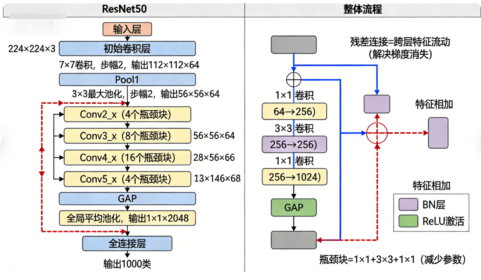 核心模块:残差块(共16个,分为4组,每组4个,分别对应Conv2_x、Conv3_x、Conv4_x、Conv5_x),ResNet50采用"瓶颈块(Bottleneck Block)",每个瓶颈块由3个卷积层组成,同时包含1条残差连接支路: