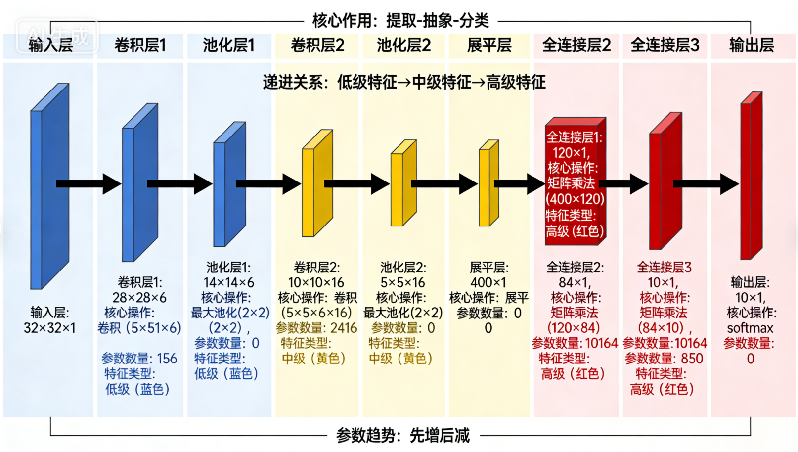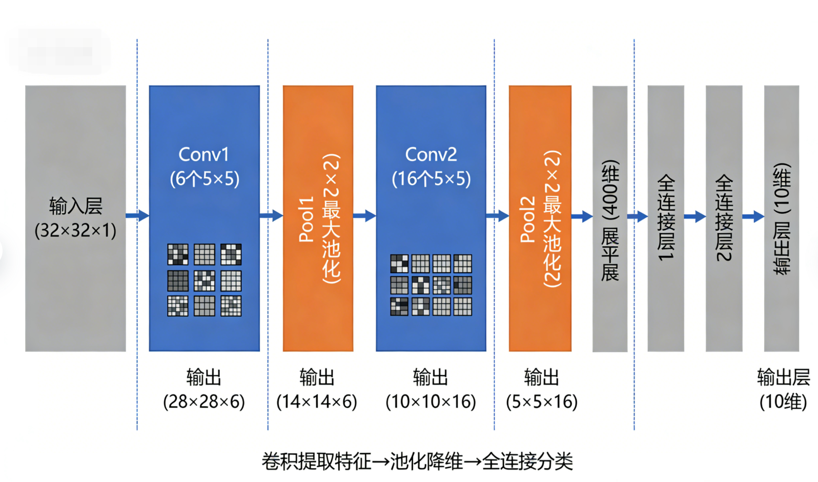 首次实现"卷积提取特征→池化降维→全连接分类"的完整流程,每一个卷积层后紧跟池化层,形成"卷积-池化"配对,避免特征冗余;