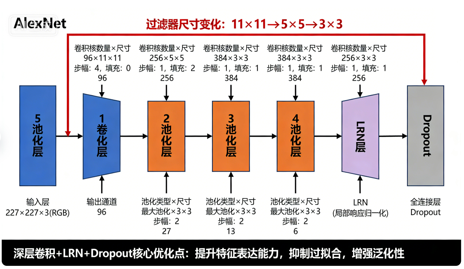 卷积层从LeNet的2层增加到5层,首次实现深层卷积架构,过滤器尺寸从大到小(11→5→3),先快速降维、再精细提取特征;