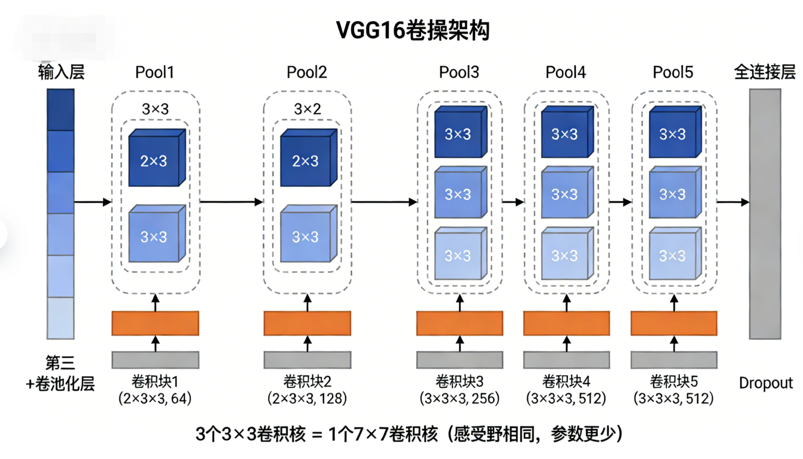 统一使用3×3卷积核(AlexNet有11、5、3三种尺寸),这是VGGNet最核心的设计:用2个3×3卷积核替代1个5×5卷积核(感受野相同,都是5×5),用3个3×3卷积核替代1个7×7卷积核,既减少参数数量(3×3×3 < 7×7),又增加非线性表达(多一层卷积+激活);