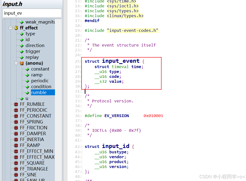 应用程序从/dev/input/eventX设备节点中读取到的,并不是某种设备私有的数据格式,而是一系列标准化的输入事件 。每一个输入事件都对应一个struct input_event结构体。应用程序在read()时,实际上就是在不断读取一个个input_event。