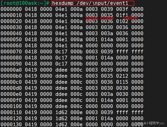 hexdump打印的是原始二进制数据,但通过对照struct input_event的定义,仍然可以解析出关键信息。例如在输出中: