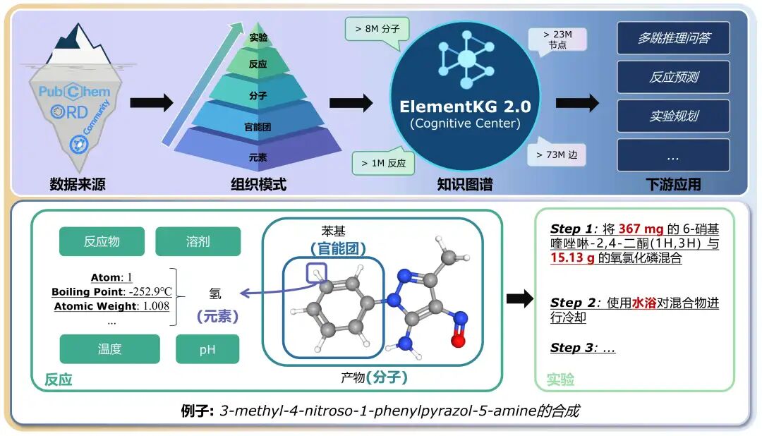近日,OpenKG SIGSciKG兴趣组正式发布全面升级的ElementKG 2.0化学知识图谱。新版本面向化学智能体的实验闭环应用,构建了覆盖"元素---官能团---分子---反应---实验"全链条的化学知识底座,旨为大模型驱动的反应预测、实验步骤生成与多跳推理问答等任务提供了统一的化学知识支撑,构建化学智能体可复用的"认知中枢"。