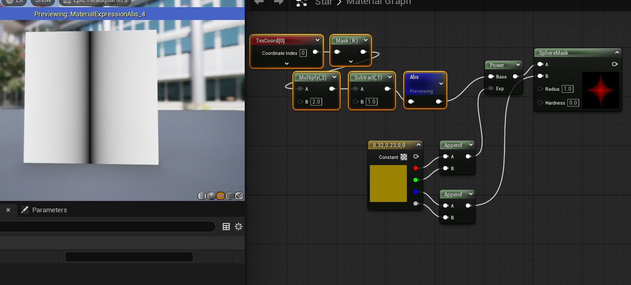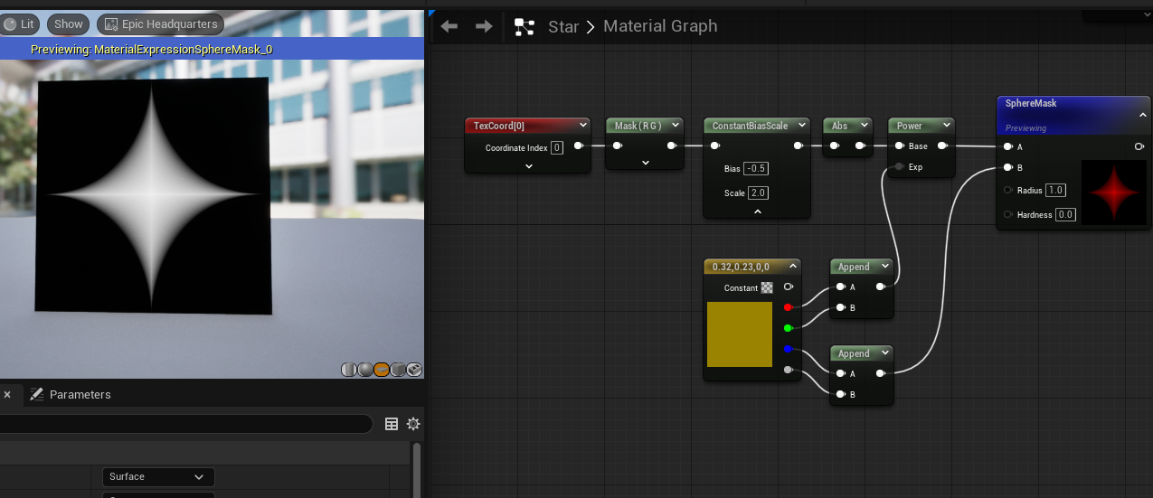 近期看见一十字光斑教程,通过对传入UV进行变化在SphereMask阶段实现变化: