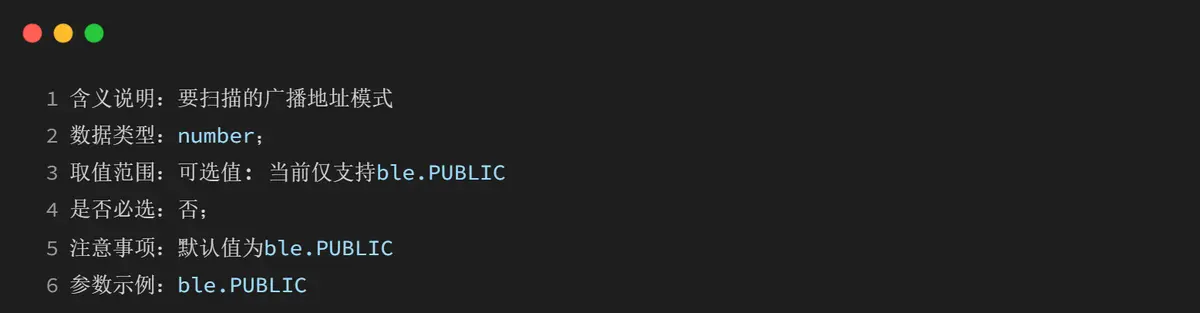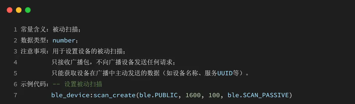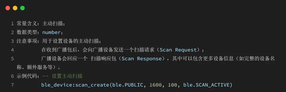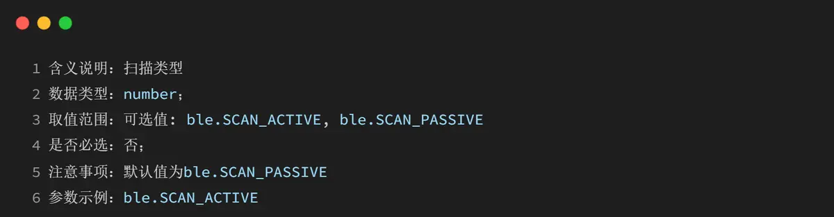 默认扫描模式为 ble.SCAN_PASSIVE,仅接收广播包,不向广播设备发送任何请求;