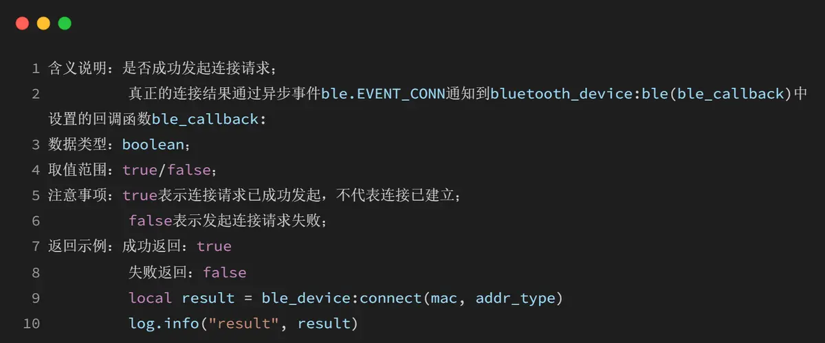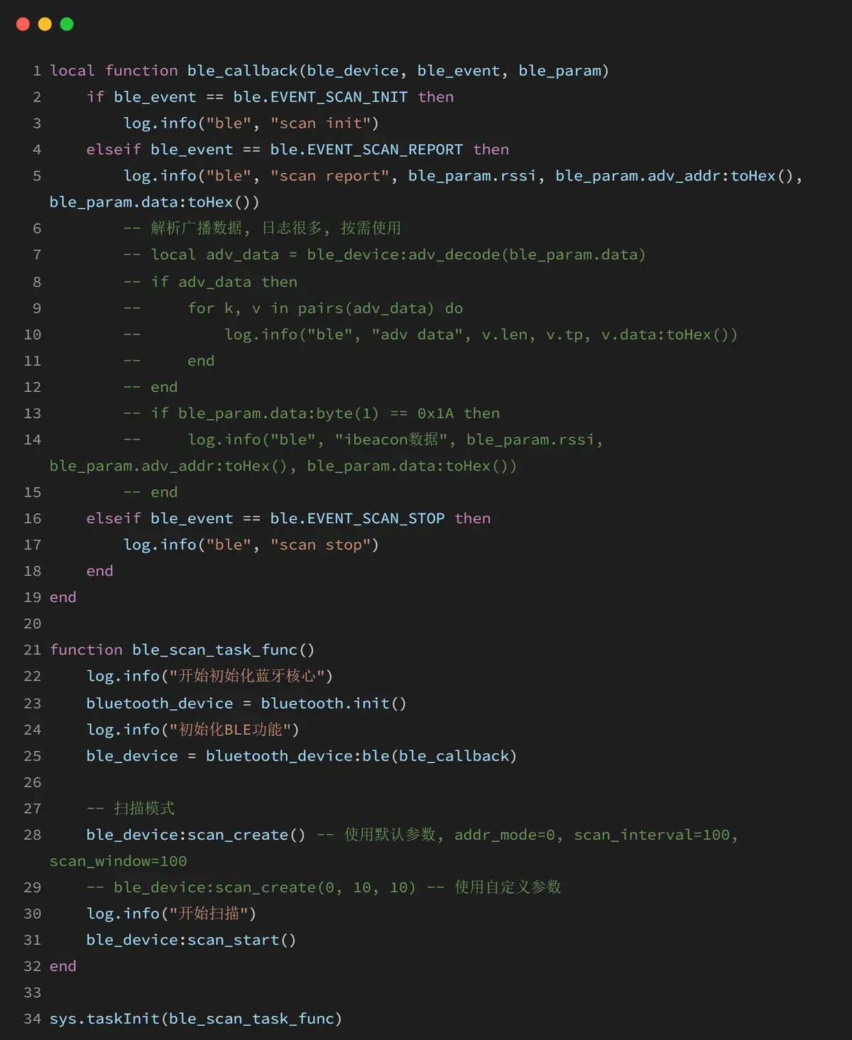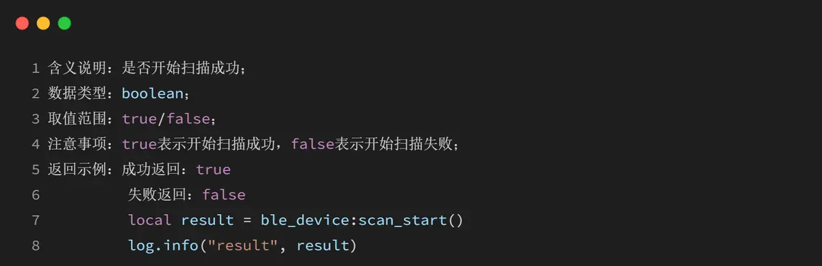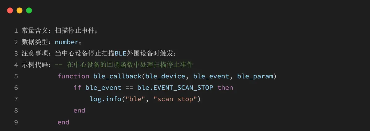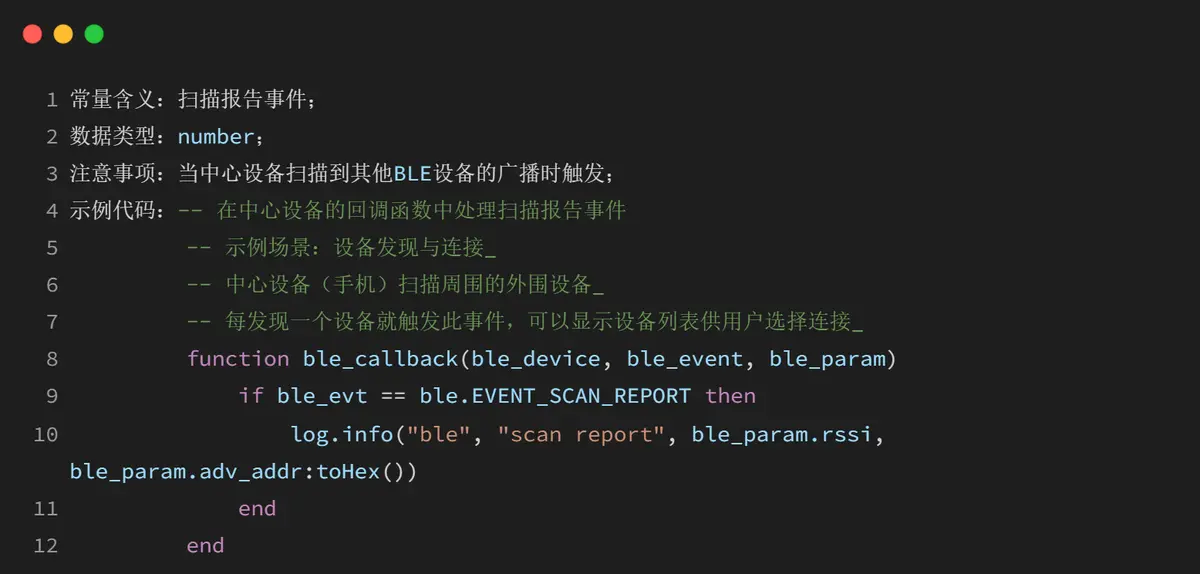 扫描到结果会触发 ble.EVENT_SCAN_REPORT 事件,执行通过 bluetooth_device:ble(ble_callback)创建 BLE 对象时注册的回调函数;