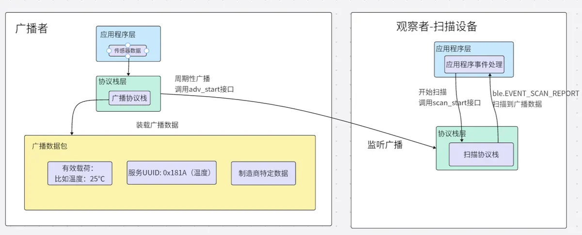 观察者模式(scan), 设备会扫描其他设备, 但不会连接其他设备。