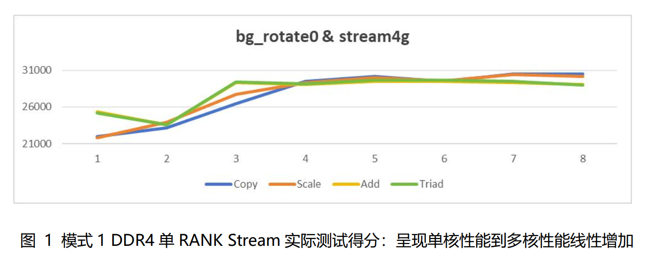 bg_rotate = 0 时,相邻读/写为相同 bank group,自由 bank个数=16,如下图 1 所示,DDR4 单 RANK Stream 实际测试得分:呈现单核性能到多核性能线性增加。图中横轴是 D3000 的核数 1-8。