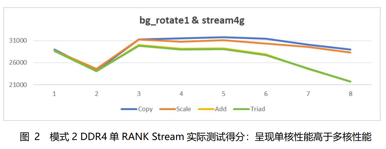 bg_rotate = 1 时,相邻读/写为不同 bank group,自由 bank个数=8,两个 bg 交替执行读/写传输,存在绑定关系,总线利用率高,自由 bank个数少,行冲突概率小,如下图 2 所示,DDR4 单 RANK Stream 实际测试得分:呈现单核性能高于多核性能。图中横轴是 D3000 的核数 1-8。