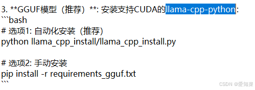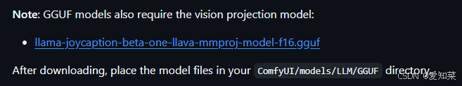 在JoyCaption的目录(ComfyUI\custom_nodes\ComfyUI-JoyCaption)里找到Readme文件,其实里面写了,要用GGUF的大语言模型,必须安装llama-cpp-python(llama.cpp 项目催生了 GGUF 格式,而 llama-cpp-python 是它在 Python 上的封装。),且有两个选项: