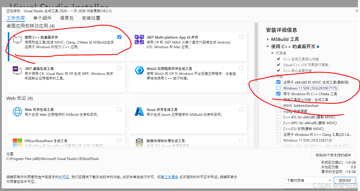 最小化安装选择:"使用 C++ 的桌面开发" -> CMake工具 + VS 2022 C++ x64/x86 生成工具。