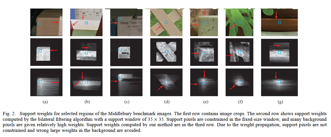 在计算支撑权重时,许多邻域滤波器严重依赖相似性项,即衡量与中心像素的颜色差异 。因此,支撑窗口内的背景像素很容易被分配高权重 。这不利于保持锐利边缘 。如图 2 第二行所示,许多属于不同物体的像素被分配了较大的权重 。为了克服这一缺陷,已有研究通过增加衡量立体图像间像素相似性的权重项 。而我们仅根据引导图像计算支撑权重 。权重值从外围向中心像素传播 。不同区域的像素将被分配极低的权重,这些像素的影响在滤波过程中可以忽略不计 。图 2(d)-(g) 显示了某些选定区域的支撑权重 。