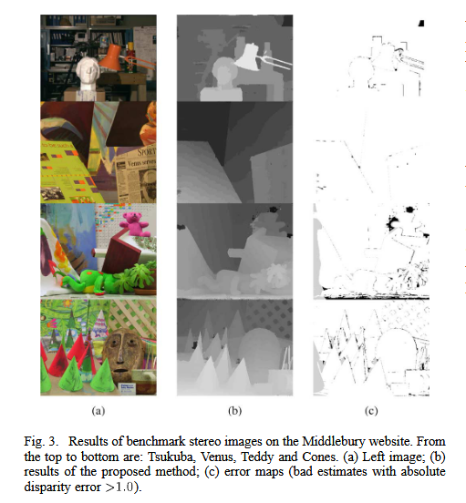 可以使用具有固定大小卷积核的滤波器,例如,均匀的(盒子滤波器)或高斯的。然而,这些方法不能很好地保持物体的边界,导致生成的视差图边缘不饱满。一个更好的选择是使用边缘保持滤波器 。最初的自适应权重方法 [ 2 ]使用双边滤波器[ 3 ]来保持视差边界。一个缺点是,双边滤波器暴力实现的复杂度依赖于核窗口的大小。尽管一些快速的实现[ 4 ] - [ 8 ],已经被重新提出,但是他们都是近似的方法,在降低复杂度的同时也降低了视差图质量。在[ 9 ]中,作者提出用测地距离来计算权重。尽管它在对象边界上表现更好,但复杂度仍然相对较高。利用多尺度方法提出了一个中间解[ 10 ]。在每个尺度中使用较小的支持窗口。在[ 11 ]中,作者使用迭代测地线扩散来得到更好的结果。最近提出的引导图像滤波器 [ 12 ]同时满足边缘保持和线性复杂度两个要求。它使用局部线性模型。使用这种滤波器的局部立体匹配算法目前报告了最好的结果[ 13 ]。虽然它声明了1的复杂性,但如果使用彩色引导图像,则需要大约22个盒子滤波过程才能完成整个引导滤波方法。 此外,现有邻域滤波器的一个共同缺点是,支持窗口是固定大小的。这对它们在大的低纹理区域的性能造成了很大的影响。希尔施米勒[ 14 ]提出了从多个方向进行路径优化来快速逼近全局代价函数,但并不是所有的像素都被利用。在[ 15 ]中,作者使用两遍范式来执行有效的聚合,但性能受限于平滑核设计。最近,Yang [ 16 ]提出了一个非局部的解决方案,代价聚合仍然被限制在一个最小生成树上。