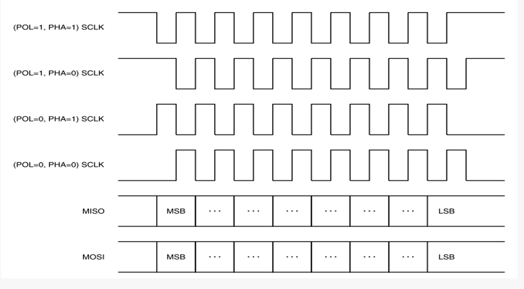 - CPHA:定义数据采样的时钟沿,CPHA=0 在时钟第一个跳变沿采样,CPHA=1 在第二个跳变沿采样。