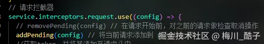 请求拦截器中,removePending 一行被注释掉了,导致整个取消逻辑不完整。