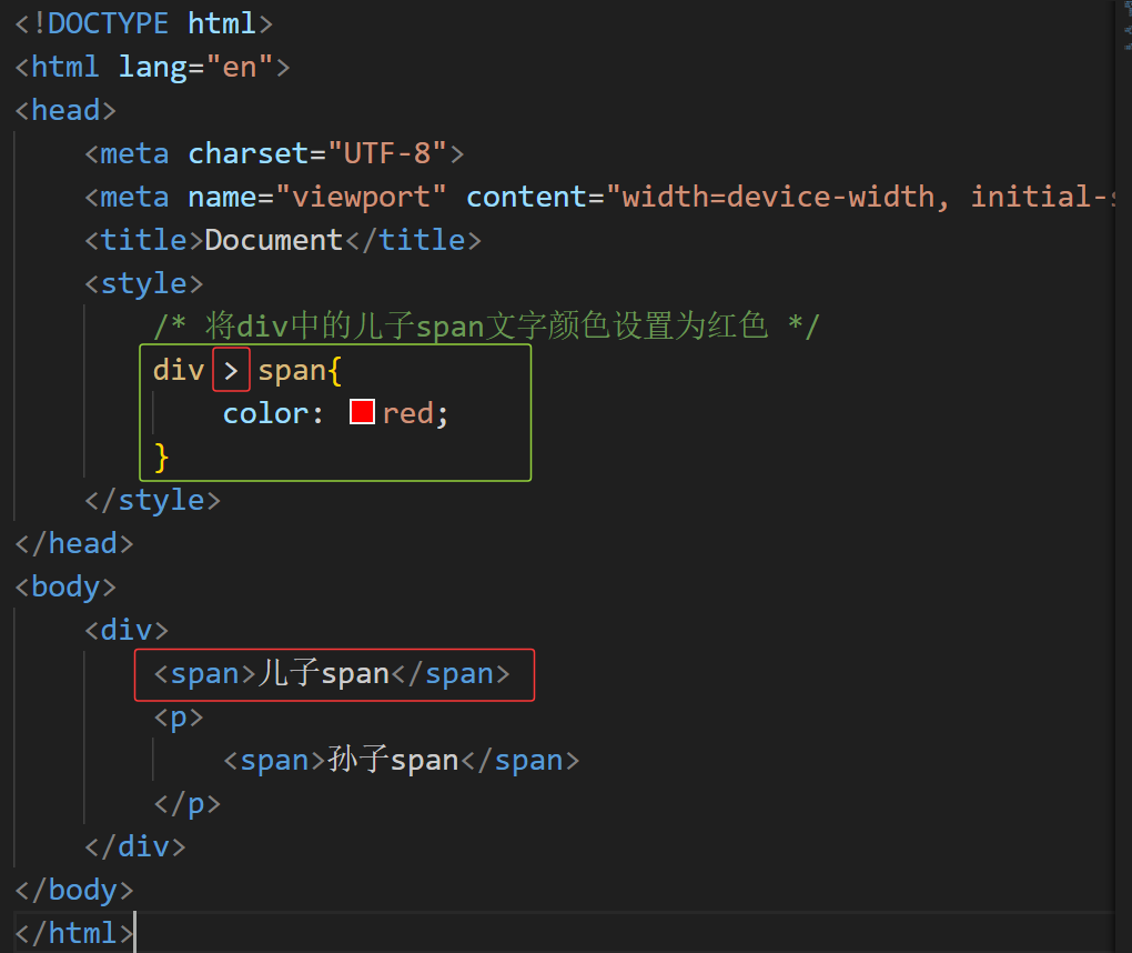 选择器写法:父选择器 > 子选择器{CSS属性},父子选择器之间用 > 隔开