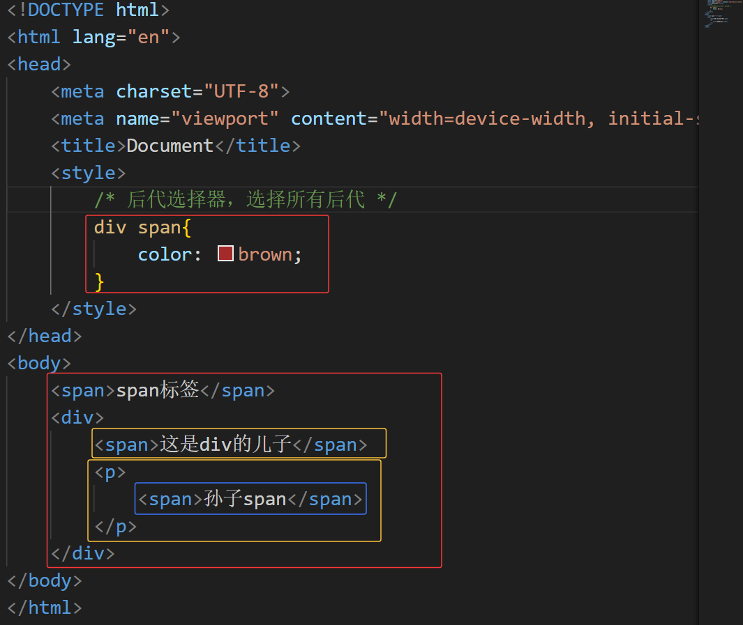 选择器写法:父选择器 子选择器{CSS属性},父子选择器之间用空格隔开