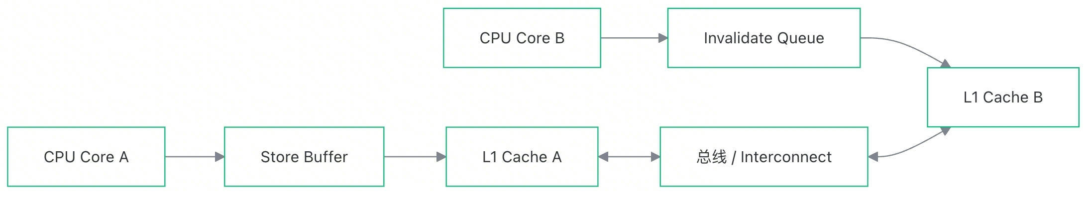 Core B 收到消息,觉得处理这个"作废"动作太慢,于是把消息扔进 Invalidate Queue,回了个"收到",然后继续干活。